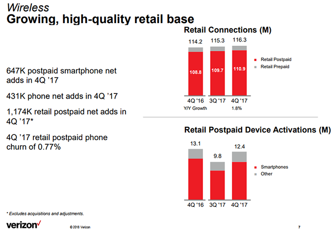 - Verizon reported a net increase of 1.2 million retail postpaid connections in fourth-quarter 2017.